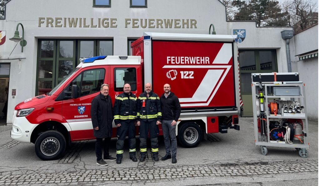 Mit dem neuen Hilfeleistungsfahrzeug 1 (HLF 1), einem Feuerwehrfahrzeug, das für die Brandbekämpfung und Löschwasserförderung, sowie für einfache technische Einsätze verwendbar ist, ist die FF Bisamberg jetzt noch moderner ausgerüstet auf ihrem Weg zu Einsatzorten im Ortsgebiet.