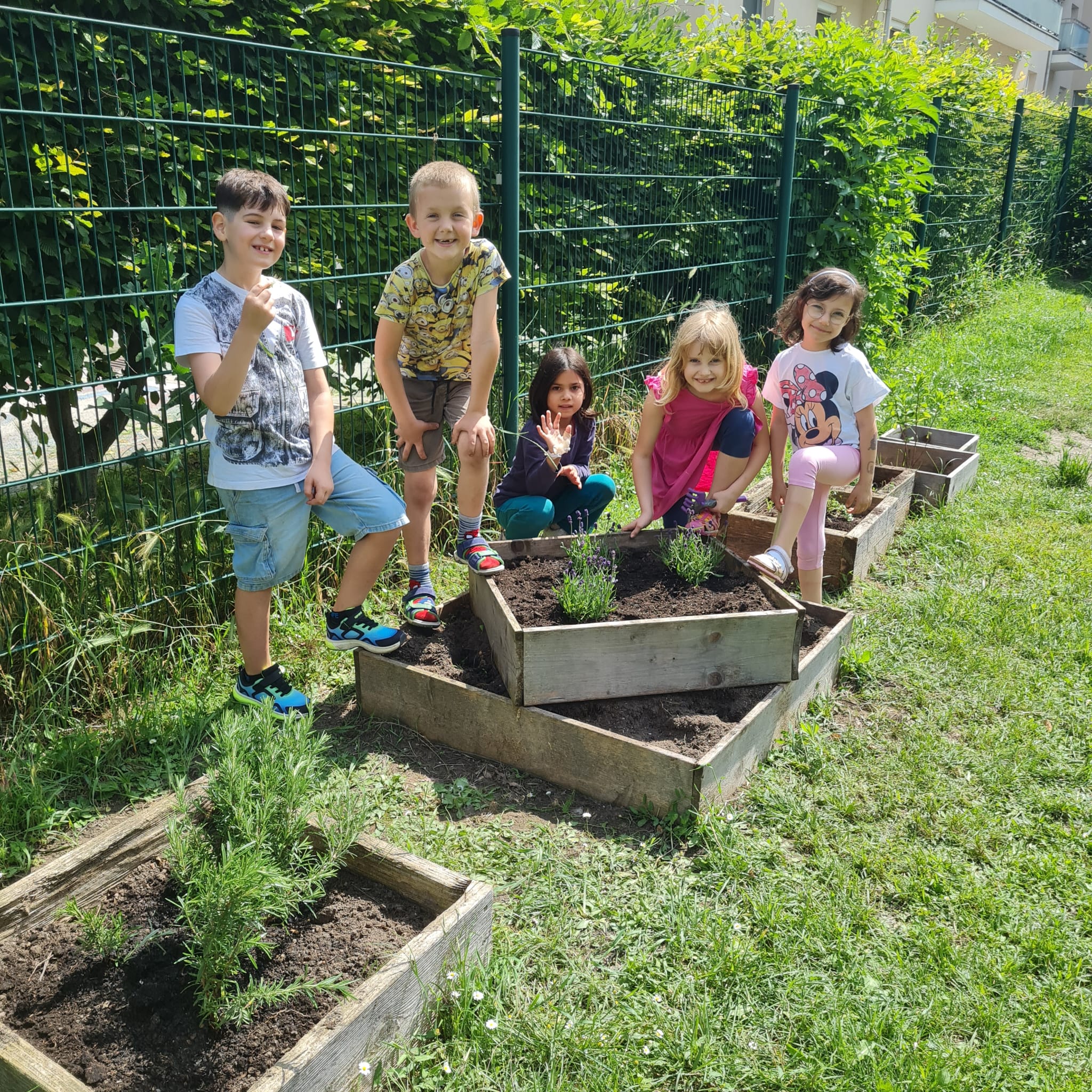 Die Beete der brachliegenden Erdäpfel-Pyramide wurden von Unkraut gesäubert, umgegraben und mit frischer Erde aufgefüllt. Vorsichtig hoben die jungen Gärtner die Pflanzen aus den Töpfen und setzten sie ein.