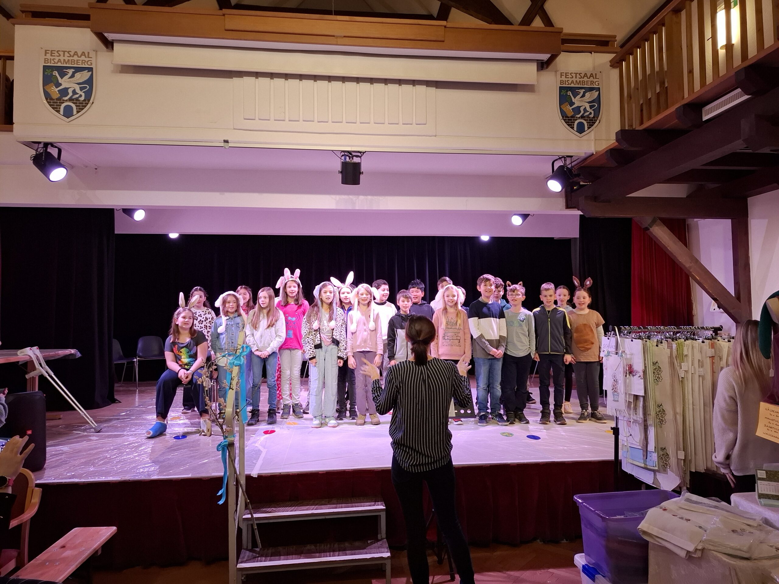 Eröffnung des Ostermarkts durch den Kinderchor der VS Bisamberg, welcher auch die Schlossgasse mit bemalten Osterhasen geschmückt hat: