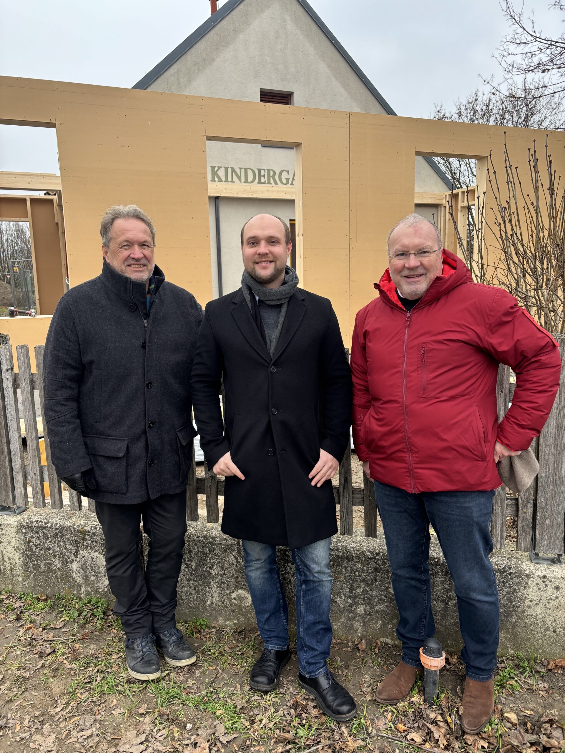 Vbgm Rupert Sitz, Bgm Johannes Stuttner und Architekt DI Andreas Pachner sind überzeugt, dass dieser Zubau nicht nur die Qualität der Betreuung steigern wird, sondern auch einen wichtigen Beitrag zur Entwicklung der Kinder leistet.