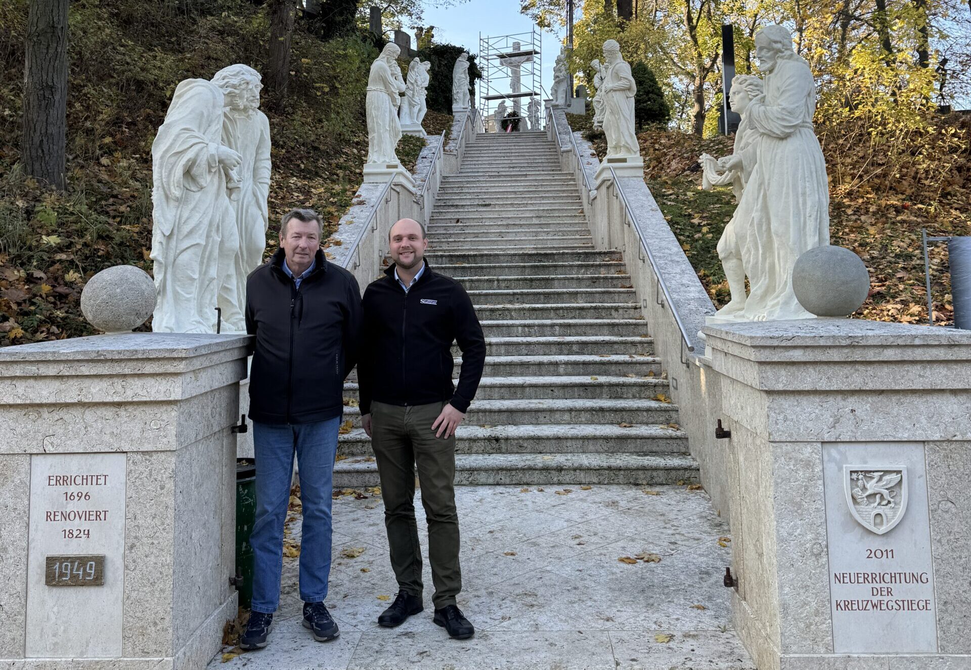 Fotos Kreuzweg und Friedhofsmauer: Bürgermeister Johannes Stuttner und für Friedhof und Denkmalpflege zuständiger Gemeinderat Martin Kernreiter