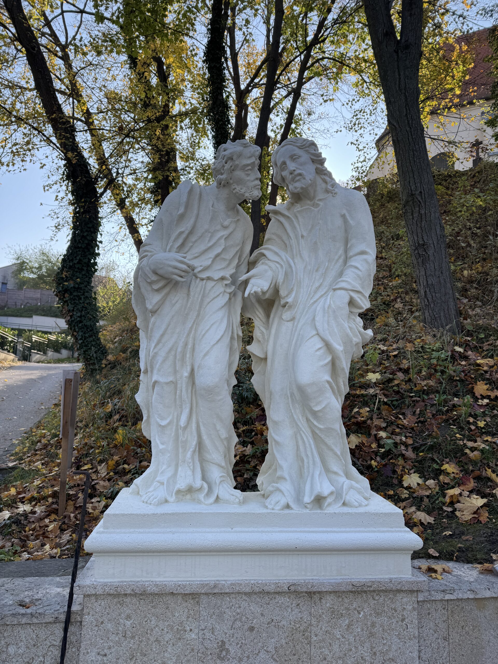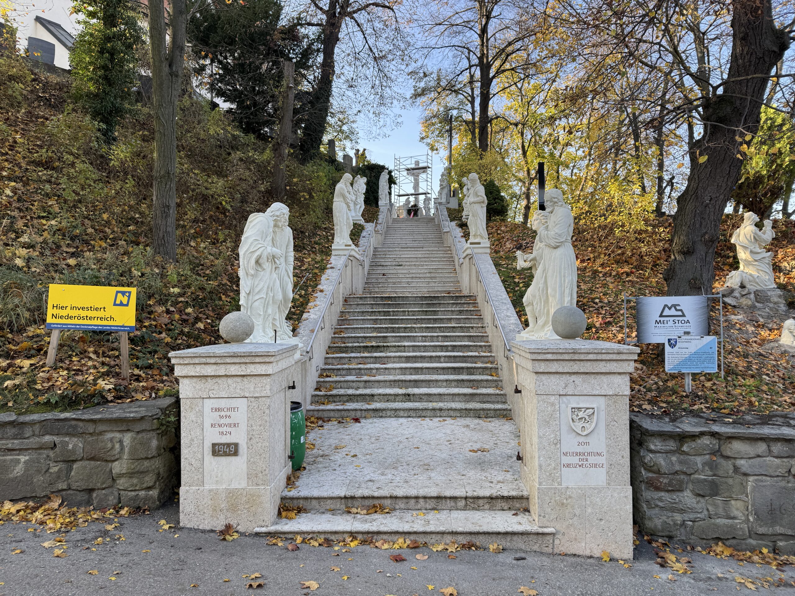 Die 23 lebensgroßen Sandsteinfiguren Figuren sind eine Mischung aus frühen Barockformen mit gotischen Zügen. Die Anlage hat 11 Figurengruppen, erinnert an die Passion Christi und ist der Heiligen Stiege in Rom nachempfunden. Der Künstler ist leider unbekannt.