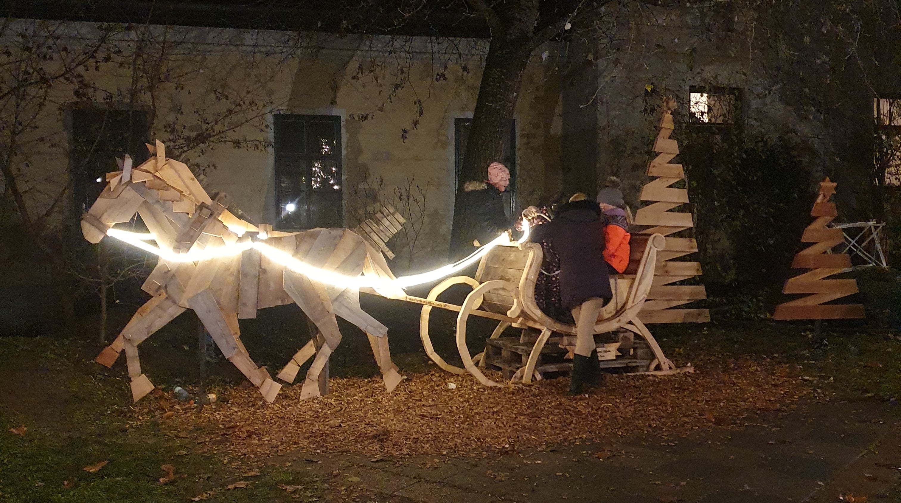 Im idyllischen Bisamberger Schlosspark kam die Holzdekoration des Bisamberger Künstlers Andreas Mathes – eine fast mannshohe Krippe und ein Pferdegespann mit Schlitten – besonders schön zur Geltung. Zu später Stunde in warmes, weißes Licht getaucht, brachte diese stimmungsvolle Dekoration jeden Besucher zum Staunen.