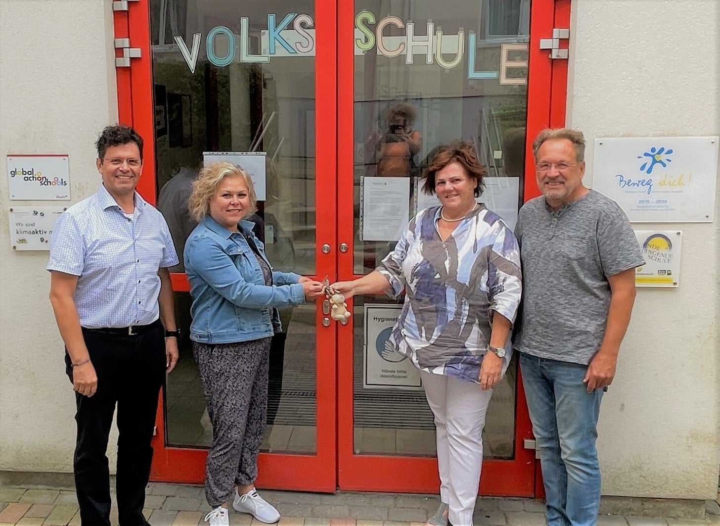 Im Schuljahr 2022/23 wird Frau Sabine Grossler, BEd, die Geschicke der Schule leiten. Symbolisch erfolgte dazu die Schlüsselübergabe in Beisein von Bgm. Dr. Günter Trettenhahn und Vizebgm. Ing. Rupert Sitz.