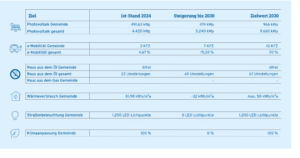 Wesentliche Bereiche im Leitbild sind die erneuerbaren Energien (Photovoltaik, Speichersysteme, Energiegemeinschaften), die Wärmeerzeugung und die Wärmedämmung. Für diese Bereiche stehen derzeit großzügige Förderungen von Bund, Land und Gemeinde zur Verfügung. Informationen dazu erhalten alle Bürgerinnen und Bürger am Bauamt.