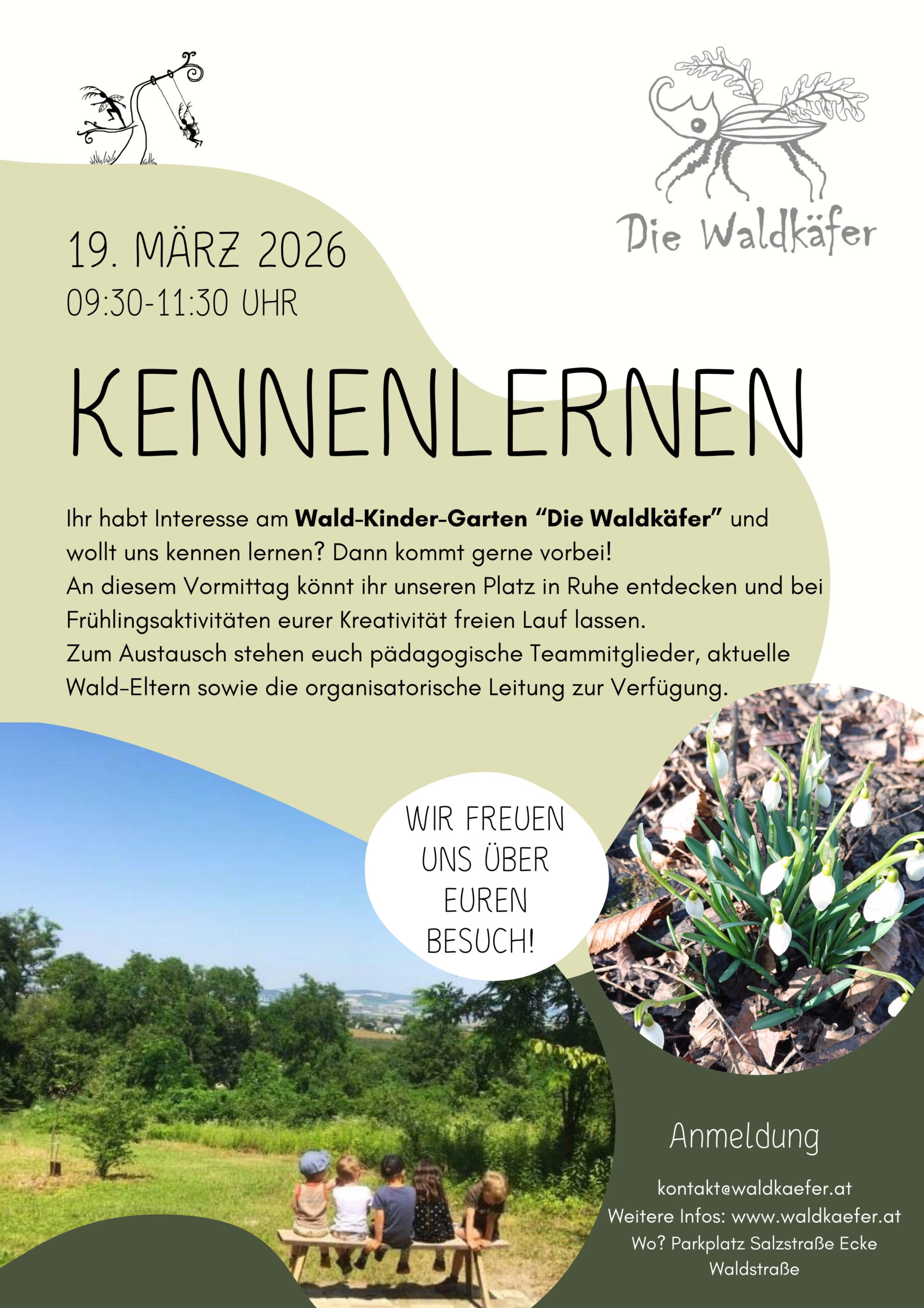 Der Wald‑Kinder‑Garten „Die Waldkäfer“ lädt interessierte Familien herzlich ein, den Platz und das pädagogische Konzept kennenzulernen.